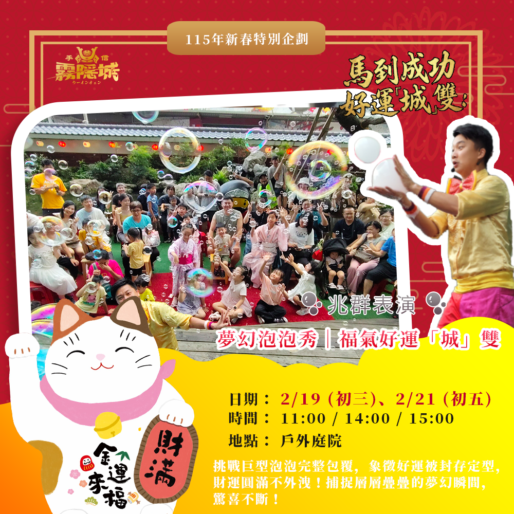 初三、初五|福氣包圍: 夢幻大師泡泡秀,巨型泡泡完整裹身,好運不外洩。