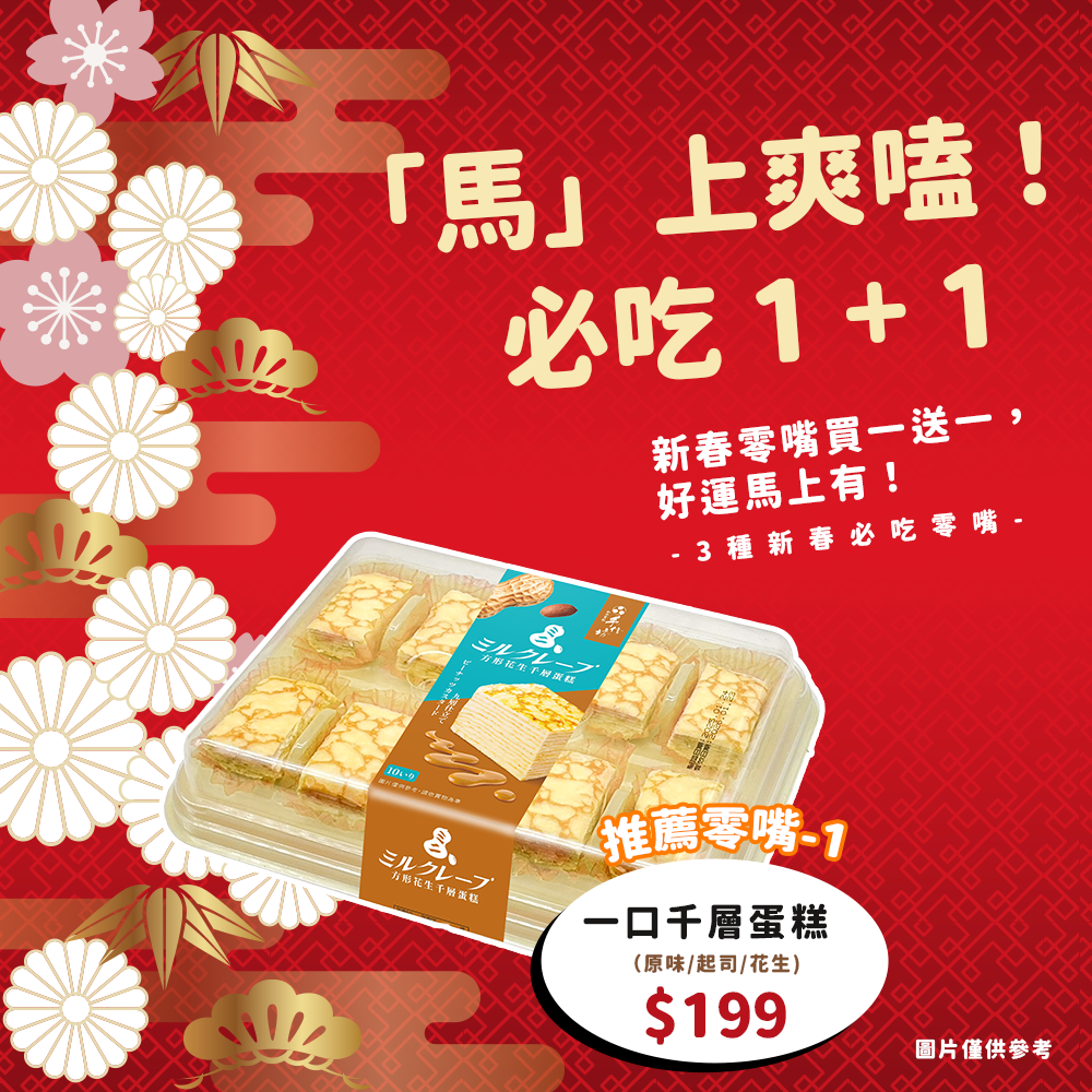 一口千層蛋糕 ($199/組):原味、起司、花生三種願望一次滿足!小巧可愛,追劇聊天必備,保證吃到停不下來。